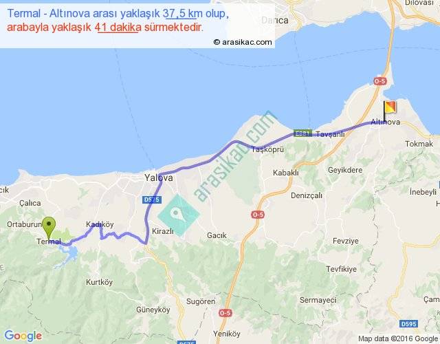Termal - Altınova arası yaklaşık olarak 90 km/h ile yukarıda belirtilen sürede olup, iki yerin kuş uçuşu uzaklığı (mesafesi) 30'dir. Yolculuk otobüsle 53 dakika sürmektedir.