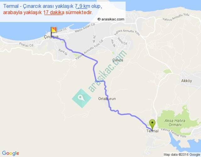 Termal - Çınarcık arası yaklaşık olarak 90 km/h ile yukarıda belirtilen sürede olup, iki yerin kuş uçuşu uzaklığı (mesafesi) 6'dir. Yolculuk otobüsle 22 dakika sürmektedir.