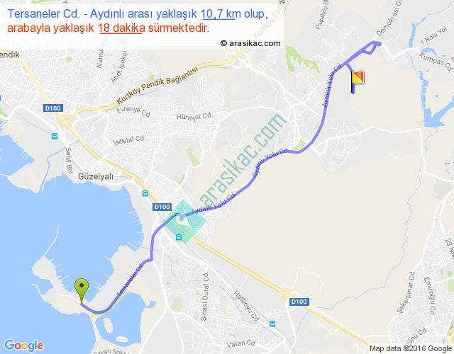 Tersaneler Cd. - Aydınlı arası yaklaşık olarak 90 km/h ile yukarıda belirtilen sürede olup, iki yerin kuş uçuşu uzaklığı (mesafesi) 7'dir. Yolculuk otobüsle 23 dakika sürmektedir.