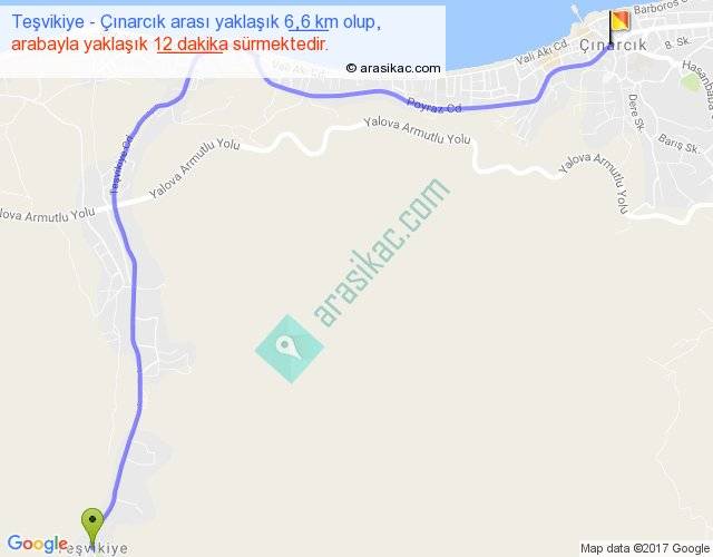 Teşvikiye - Çınarcık arası yaklaşık olarak 90 km/h ile yukarıda belirtilen sürede olup, iki yerin kuş uçuşu uzaklığı (mesafesi) 5'dir. Yolculuk otobüsle 15 dakika sürmektedir.