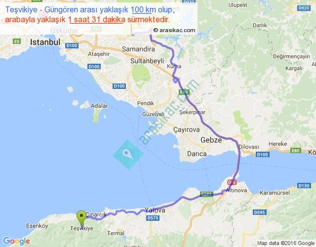 Teşvikiye - Güngören arası yaklaşık olarak 90 km/h ile yukarıda belirtilen sürede olup, iki yerin kuş uçuşu uzaklığı (mesafesi) 47'dir. Yolculuk otobüsle 1 saat 58 dakika sürmektedir.