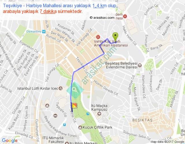 Teşvikiye - Harbiye Mahallesi arası yaklaşık olarak 90 km/h ile yukarıda belirtilen sürede olup, iki yerin kuş uçuşu uzaklığı (mesafesi) 1'dir. Yolculuk otobüsle 9 dakika sürmektedir.