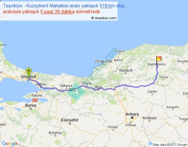 Teşvikiye - Kuzeykent Mahallesi arası yaklaşık olarak 90 km/h ile yukarıda belirtilen sürede olup, iki yerin kuş uçuşu uzaklığı (mesafesi) 400'dir. Eğer belirtilen yerler arasında uçak seferi var ise bu süre uçakla 36 dakika'ya kadar düşebilir. Yolculuk otobüsle 7 saat 16 dakika sürmektedir.