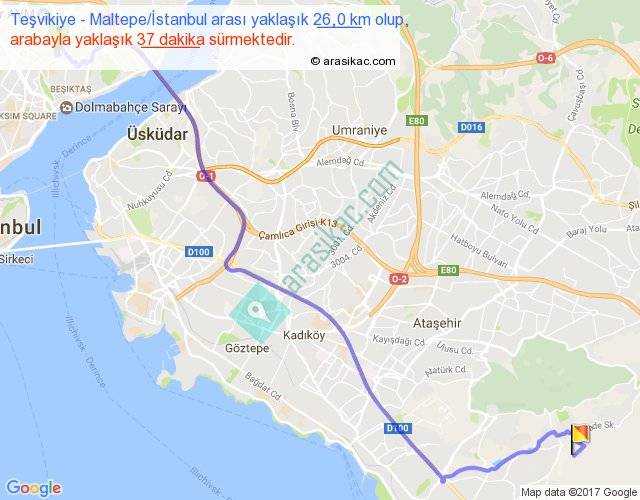 Teşvikiye - Maltepe İstanbul arası yaklaşık olarak 90 km/h ile yukarıda belirtilen sürede olup, iki yerin kuş uçuşu uzaklığı (mesafesi) 19'dir. Yolculuk otobüsle 48 dakika sürmektedir.
