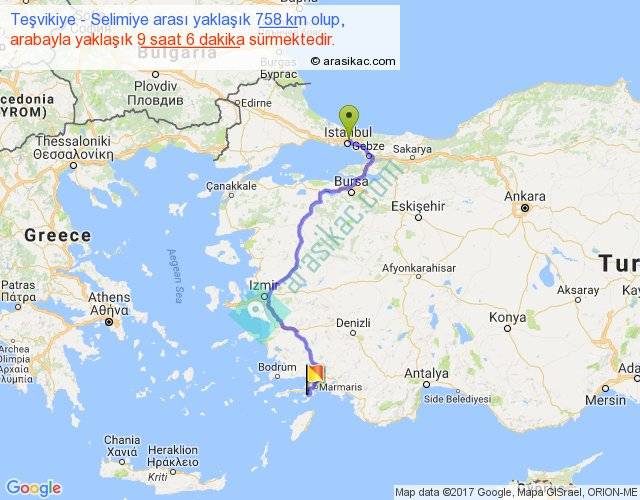 Teşvikiye - Selimiye arası yaklaşık olarak 90 km/h ile yukarıda belirtilen sürede olup, iki yerin kuş uçuşu uzaklığı (mesafesi) 487'dir. Eğer belirtilen yerler arasında uçak seferi var ise bu süre uçakla 44 dakika'ya kadar düşebilir. Yolculuk otobüsle 11 saat 49 dakika sürmektedir.
