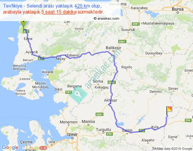 Tevfikiye - Selendi arası yaklaşık olarak 90 km/h ile yukarıda belirtilen sürede olup, iki yerin kuş uçuşu uzaklığı (mesafesi) 261'dir. Eğer belirtilen yerler arasında uçak seferi var ise bu süre uçakla 24 dakika'ya kadar düşebilir. Yolculuk otobüsle 6 saat 49 dakika sürmektedir.