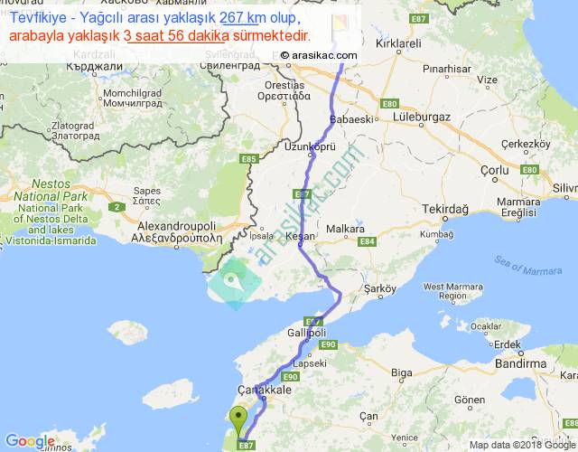 Tevfikiye - Yağcılı arası yaklaşık olarak 90 km/h ile yukarıda belirtilen sürede olup, iki yerin kuş uçuşu uzaklığı (mesafesi) 207'dir. Yolculuk otobüsle 5 saat 6 dakika sürmektedir.