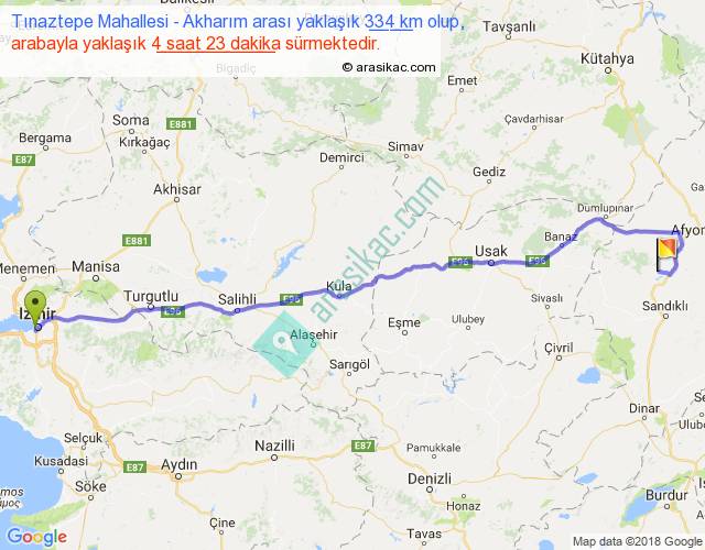 Tınaztepe Mahallesi - Akharım arası yaklaşık olarak 90 km/h ile yukarıda belirtilen sürede olup, iki yerin kuş uçuşu uzaklığı (mesafesi) 270'dir. Eğer belirtilen yerler arasında uçak seferi var ise bu süre uçakla 24 dakika'ya kadar düşebilir. Yolculuk otobüsle 5 saat 41 dakika sürmektedir.
