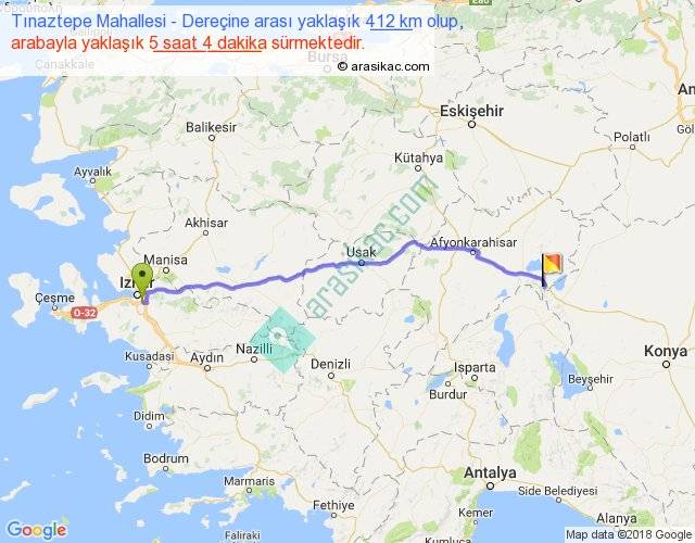 Tınaztepe Mahallesi - Dereçine arası yaklaşık olarak 90 km/h ile yukarıda belirtilen sürede olup, iki yerin kuş uçuşu uzaklığı (mesafesi) 352'dir. Eğer belirtilen yerler arasında uçak seferi var ise bu süre uçakla 32 dakika'ya kadar düşebilir. Yolculuk otobüsle 6 saat 35 dakika sürmektedir.