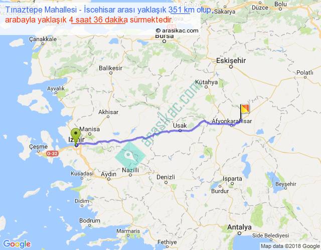 Tınaztepe Mahallesi - İscehisar arası yaklaşık olarak 90 km/h ile yukarıda belirtilen sürede olup, iki yerin kuş uçuşu uzaklığı (mesafesi) 316'dir. Eğer belirtilen yerler arasında uçak seferi var ise bu süre uçakla 29 dakika'ya kadar düşebilir. Yolculuk otobüsle 5 saat 58 dakika sürmektedir.