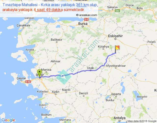 Tınaztepe Mahallesi - Kırka arası yaklaşık olarak 90 km/h ile yukarıda belirtilen sürede olup, iki yerin kuş uçuşu uzaklığı (mesafesi) 308'dir. Eğer belirtilen yerler arasında uçak seferi var ise bu süre uçakla 28 dakika'ya kadar düşebilir. Yolculuk otobüsle 6 saat 15 dakika sürmektedir.