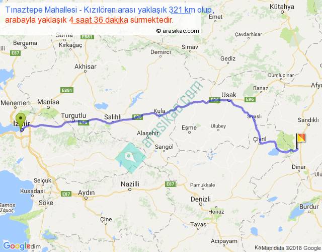 Tınaztepe Mahallesi - Kızılören arası yaklaşık olarak 90 km/h ile yukarıda belirtilen sürede olup, iki yerin kuş uçuşu uzaklığı (mesafesi) 263'dir. Eğer belirtilen yerler arasında uçak seferi var ise bu süre uçakla 24 dakika'ya kadar düşebilir. Yolculuk otobüsle 5 saat 58 dakika sürmektedir.