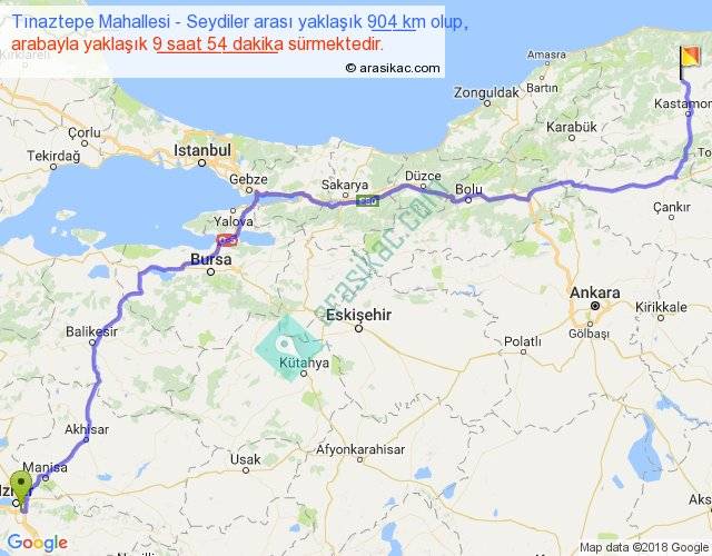Tınaztepe Mahallesi - Seydiler arası yaklaşık olarak 90 km/h ile yukarıda belirtilen sürede olup, iki yerin kuş uçuşu uzaklığı (mesafesi) 659'dir. Eğer belirtilen yerler arasında uçak seferi var ise bu süre uçakla 1 saat 00 dakika'ya kadar düşebilir. Yolculuk otobüsle 12 saat 52 dakika sürmektedir.
