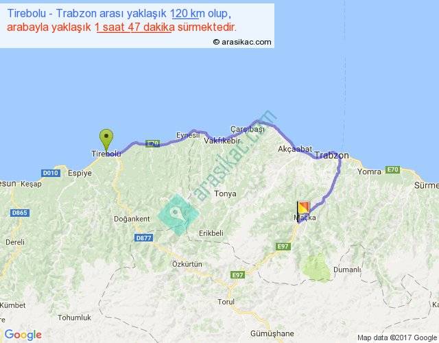 Tirebolu - Trabzon arası yaklaşık olarak 90 km/h ile yukarıda belirtilen sürede olup, iki yerin kuş uçuşu uzaklığı (mesafesi) 68'dir. Yolculuk otobüsle 2 saat 19 dakika sürmektedir.