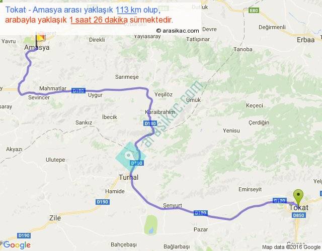 Tokat - Amasya arası yaklaşık olarak 90 km/h ile yukarıda belirtilen sürede olup, iki yerin kuş uçuşu uzaklığı (mesafesi) 70'dir. Yolculuk otobüsle 1 saat 51 dakika sürmektedir.