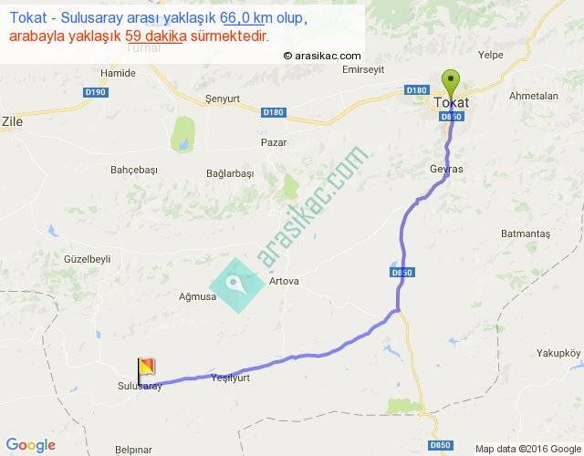 Tokat - Sulusaray arası yaklaşık olarak 90 km/h ile yukarıda belirtilen sürede olup, iki yerin kuş uçuşu uzaklığı (mesafesi) 54'dir. Yolculuk otobüsle 1 saat 16 dakika sürmektedir.
