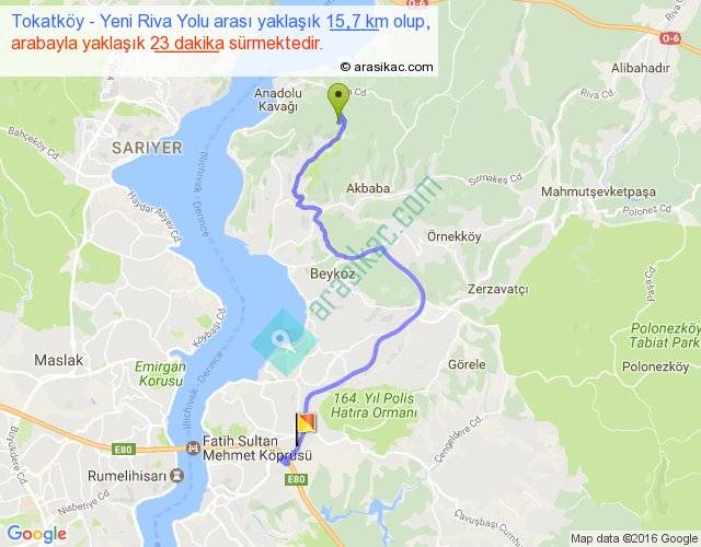 Tokatköy - Yeni Riva Yolu arası yaklaşık olarak 90 km/h ile yukarıda belirtilen sürede olup, iki yerin kuş uçuşu uzaklığı (mesafesi) 9'dir. Yolculuk otobüsle 29 dakika sürmektedir.