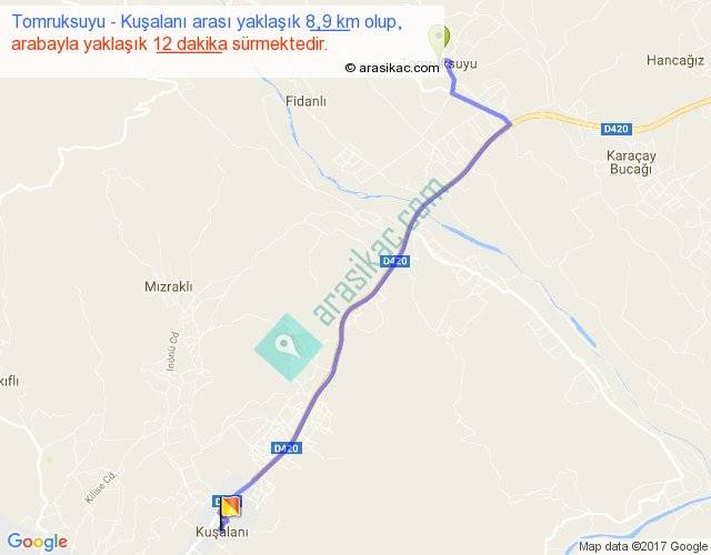 Tomruksuyu - Kuşalanı arası yaklaşık olarak 90 km/h ile yukarıda belirtilen sürede olup, iki yerin kuş uçuşu uzaklığı (mesafesi) 7'dir. Yolculuk otobüsle 15 dakika sürmektedir.