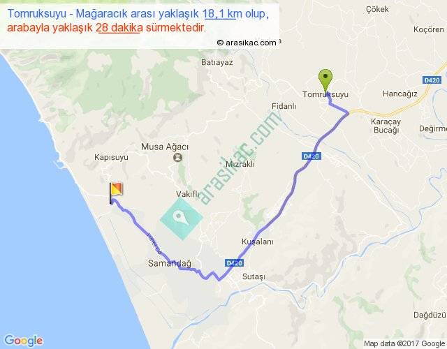 Tomruksuyu - Mağaracık arası yaklaşık olarak 90 km/h ile yukarıda belirtilen sürede olup, iki yerin kuş uçuşu uzaklığı (mesafesi) 11'dir. Yolculuk otobüsle 36 dakika sürmektedir.