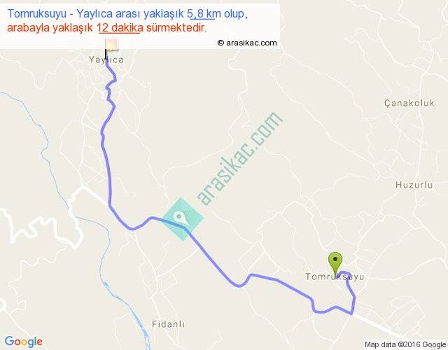 Tomruksuyu - Yaylıca arası yaklaşık olarak 90 km/h ile yukarıda belirtilen sürede olup, iki yerin kuş uçuşu uzaklığı (mesafesi) 3'dir. Yolculuk otobüsle 15 dakika sürmektedir.