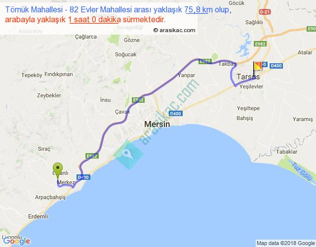 Tömük Mahallesi - 82 Evler Mahallesi arası yaklaşık olarak 90 km/h ile yukarıda belirtilen sürede olup, iki yerin kuş uçuşu uzaklığı (mesafesi) 55'dir. Yolculuk otobüsle 1 saat 18 dakika sürmektedir.