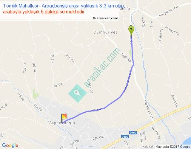 Tömük Mahallesi - Arpaçbahşiş arası yaklaşık olarak 90 km/h ile yukarıda belirtilen sürede olup, iki yerin kuş uçuşu uzaklığı (mesafesi) 3'dir. Yolculuk otobüsle 6 dakika sürmektedir.