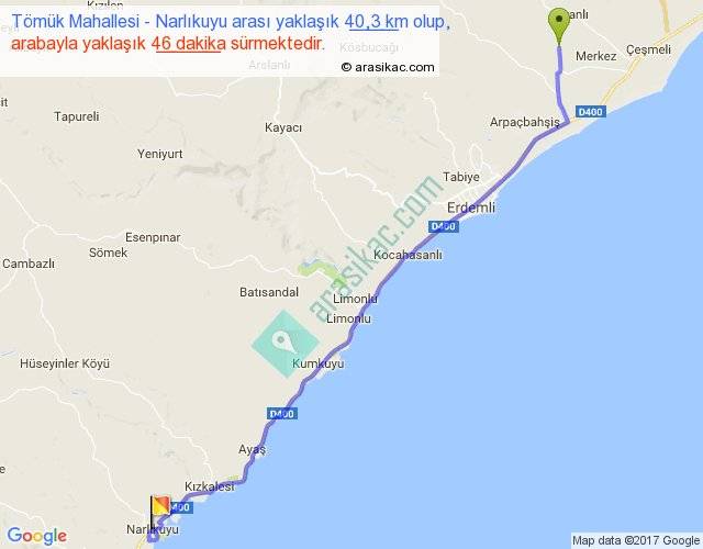 Tömük Mahallesi - Narlıkuyu arası yaklaşık olarak 90 km/h ile yukarıda belirtilen sürede olup, iki yerin kuş uçuşu uzaklığı (mesafesi) 35'dir. Yolculuk otobüsle 59 dakika sürmektedir.