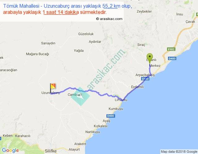 Tömük Mahallesi - Uzuncaburç arası yaklaşık olarak 90 km/h ile yukarıda belirtilen sürede olup, iki yerin kuş uçuşu uzaklığı (mesafesi) 41'dir. Yolculuk otobüsle 1 saat 36 dakika sürmektedir.