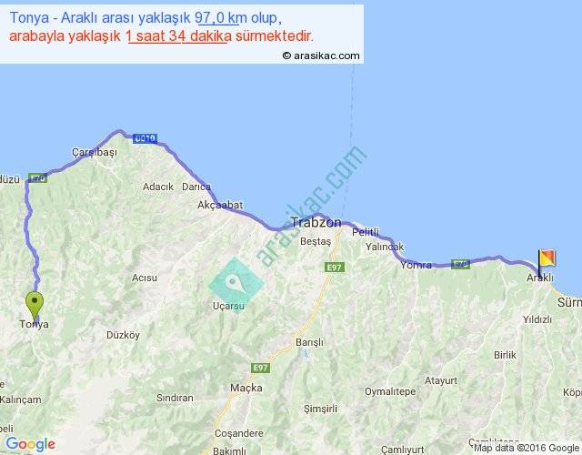 Tonya - Araklı arası yaklaşık olarak 90 km/h ile yukarıda belirtilen sürede olup, iki yerin kuş uçuşu uzaklığı (mesafesi) 64'dir. Yolculuk otobüsle 2 saat 2 dakika sürmektedir.
