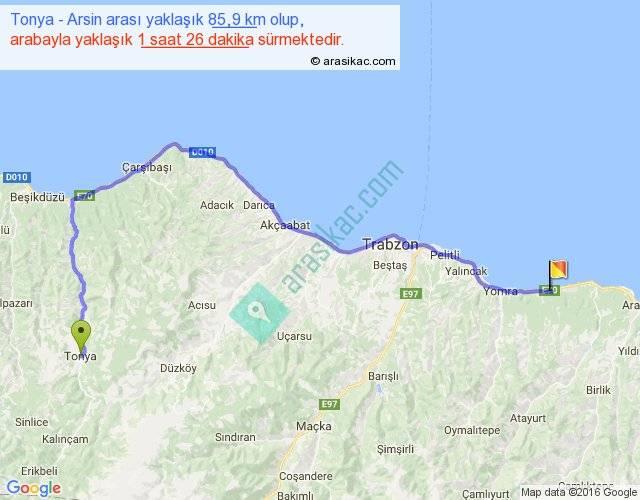 Tonya - Arsin arası yaklaşık olarak 90 km/h ile yukarıda belirtilen sürede olup, iki yerin kuş uçuşu uzaklığı (mesafesi) 55'dir. Yolculuk otobüsle 1 saat 51 dakika sürmektedir.