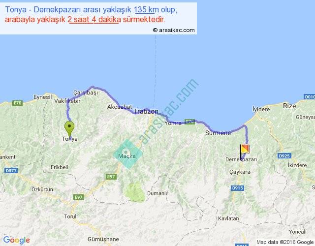 Tonya - Dernekpazarı arası yaklaşık olarak 90 km/h ile yukarıda belirtilen sürede olup, iki yerin kuş uçuşu uzaklığı (mesafesi) 81'dir. Yolculuk otobüsle 2 saat 41 dakika sürmektedir.
