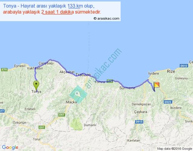 Tonya - Hayrat arası yaklaşık olarak 90 km/h ile yukarıda belirtilen sürede olup, iki yerin kuş uçuşu uzaklığı (mesafesi) 90'dir. Yolculuk otobüsle 2 saat 37 dakika sürmektedir.