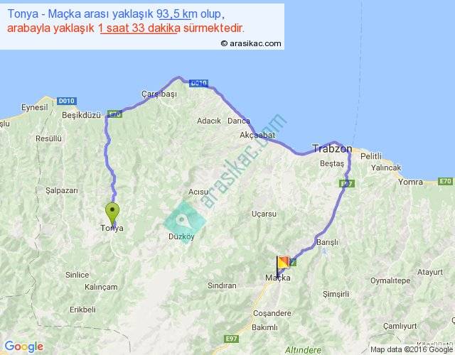 Tonya - Maçka arası yaklaşık olarak 90 km/h ile yukarıda belirtilen sürede olup, iki yerin kuş uçuşu uzaklığı (mesafesi) 28'dir. Yolculuk otobüsle 2 saat 0 dakika sürmektedir.