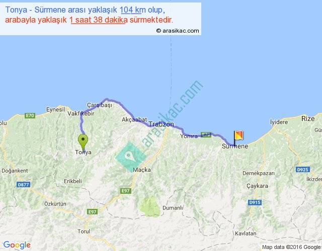 Tonya - Sürmene arası yaklaşık olarak 90 km/h ile yukarıda belirtilen sürede olup, iki yerin kuş uçuşu uzaklığı (mesafesi) 69'dir. Yolculuk otobüsle 2 saat 7 dakika sürmektedir.