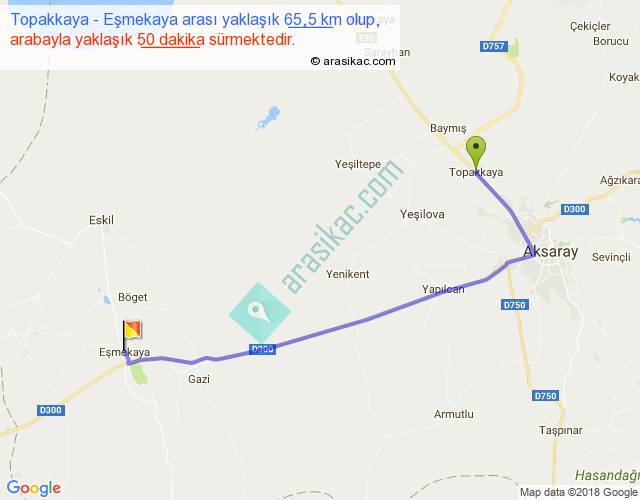 Topakkaya - Eşmekaya arası yaklaşık olarak 90 km/h ile yukarıda belirtilen sürede olup, iki yerin kuş uçuşu uzaklığı (mesafesi) 47'dir. Yolculuk otobüsle 1 saat 5 dakika sürmektedir.