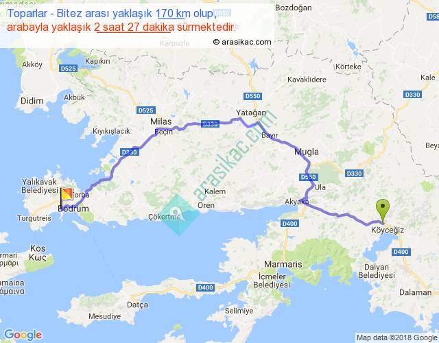 Toparlar - Bitez arası yaklaşık olarak 90 km/h ile yukarıda belirtilen sürede olup, iki yerin kuş uçuşu uzaklığı (mesafesi) 114'dir. Yolculuk otobüsle 3 saat 11 dakika sürmektedir.