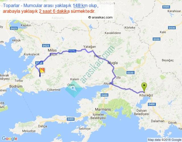 Toparlar - Mumcular arası yaklaşık olarak 90 km/h ile yukarıda belirtilen sürede olup, iki yerin kuş uçuşu uzaklığı (mesafesi) 90'dir. Yolculuk otobüsle 2 saat 43 dakika sürmektedir.