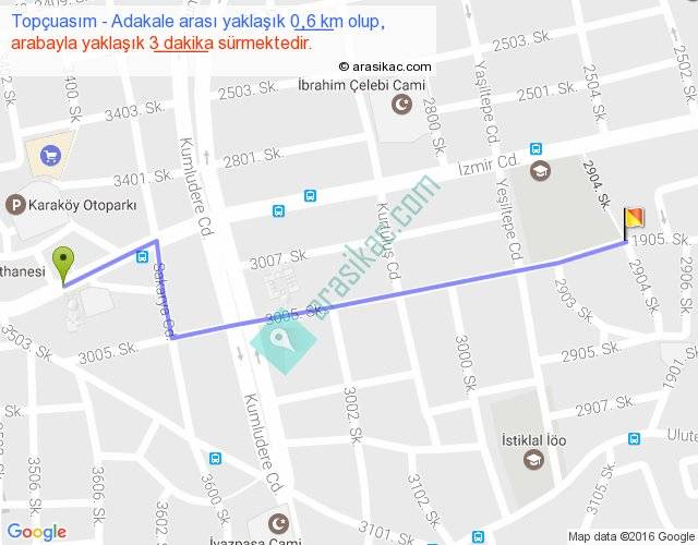 Topçuasım - Adakale arası yaklaşık olarak 90 km/h ile yukarıda belirtilen sürede olup, iki yerin kuş uçuşu uzaklığı (mesafesi) 0'dir. Yolculuk otobüsle 3 dakika sürmektedir.