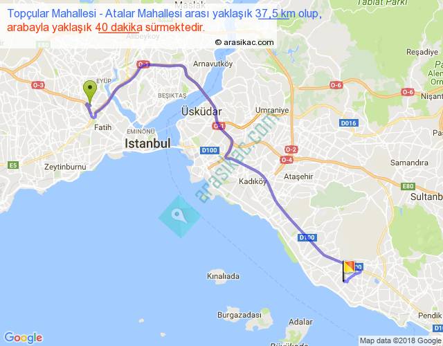 Topçular Mahallesi - Atalar Mahallesi arası yaklaşık olarak 90 km/h ile yukarıda belirtilen sürede olup, iki yerin kuş uçuşu uzaklığı (mesafesi) 26'dir. Yolculuk otobüsle 52 dakika sürmektedir.
