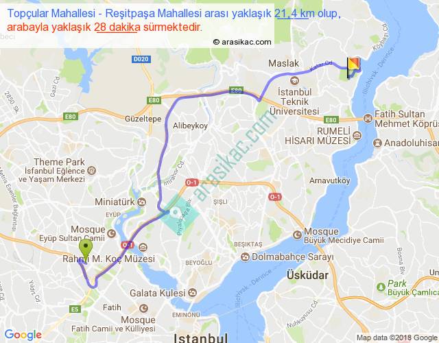 Topçular Mahallesi - Reşitpaşa Mahallesi arası yaklaşık olarak 90 km/h ile yukarıda belirtilen sürede olup, iki yerin kuş uçuşu uzaklığı (mesafesi) 13'dir. Yolculuk otobüsle 36 dakika sürmektedir.