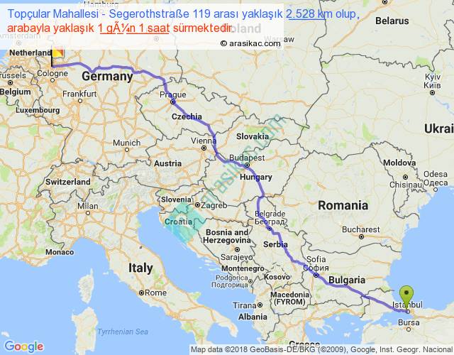 Topçular Mahallesi - Segerothstraße 119 arası yaklaşık olarak 90 km/h ile yukarıda belirtilen sürede olup, iki yerin kuş uçuşu uzaklığı (mesafesi) 2021'dir. Eğer belirtilen yerler arasında uçak seferi var ise bu süre uçakla 3 saat 06 dakika'ya kadar düşebilir. Yolculuk otobüsle 1 gün 8 saat sürmektedir.