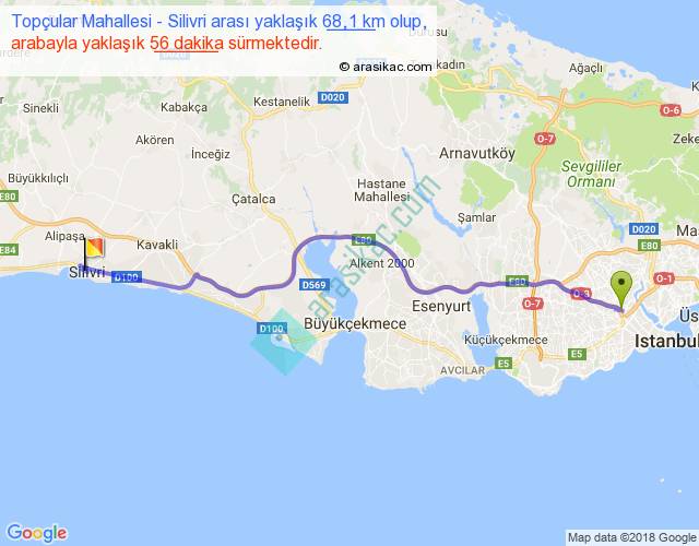 Topçular Mahallesi - Silivri arası yaklaşık olarak 90 km/h ile yukarıda belirtilen sürede olup, iki yerin kuş uçuşu uzaklığı (mesafesi) 56'dir. Yolculuk otobüsle 1 saat 12 dakika sürmektedir.
