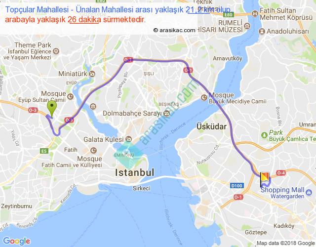Topçular Mahallesi - Ünalan Mahallesi arası yaklaşık olarak 90 km/h ile yukarıda belirtilen sürede olup, iki yerin kuş uçuşu uzaklığı (mesafesi) 13'dir. Yolculuk otobüsle 33 dakika sürmektedir.