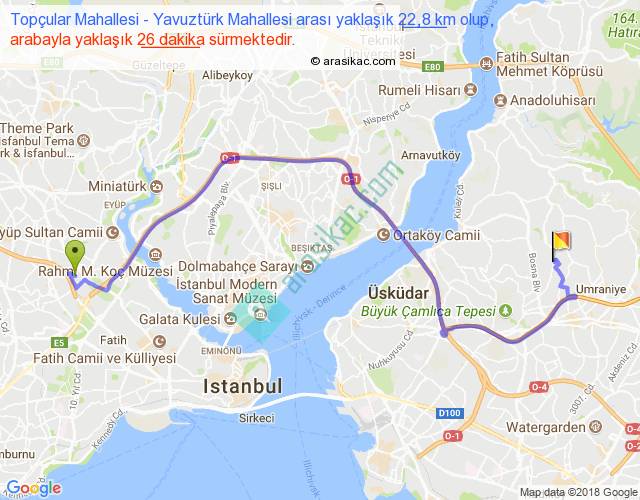 Topçular Mahallesi - Yavuztürk Mahallesi arası yaklaşık olarak 90 km/h ile yukarıda belirtilen sürede olup, iki yerin kuş uçuşu uzaklığı (mesafesi) 14'dir. Yolculuk otobüsle 33 dakika sürmektedir.