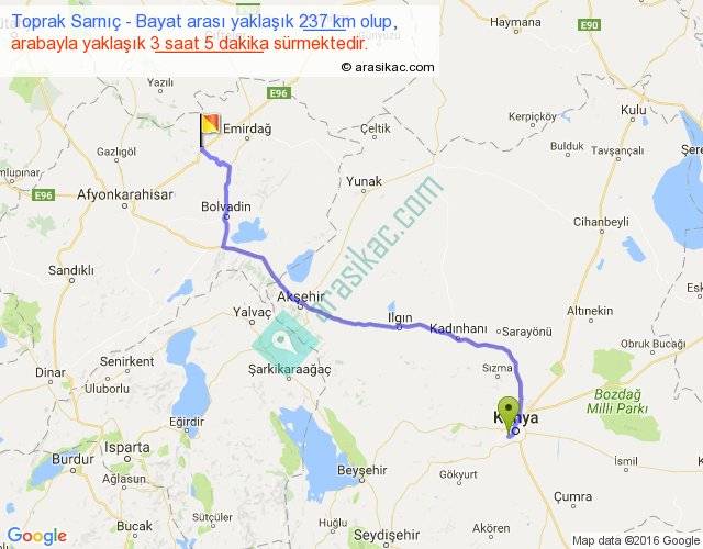Toprak Sarnıç - Bayat arası yaklaşık olarak 90 km/h ile yukarıda belirtilen sürede olup, iki yerin kuş uçuşu uzaklığı (mesafesi) 182'dir. Yolculuk otobüsle 4 saat 0 dakika sürmektedir.
