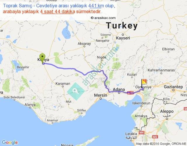 Toprak Sarnıç - Cevdetiye arası yaklaşık olarak 90 km/h ile yukarıda belirtilen sürede olup, iki yerin kuş uçuşu uzaklığı (mesafesi) 338'dir. Eğer belirtilen yerler arasında uçak seferi var ise bu süre uçakla 31 dakika'ya kadar düşebilir. Yolculuk otobüsle 6 saat 9 dakika sürmektedir.