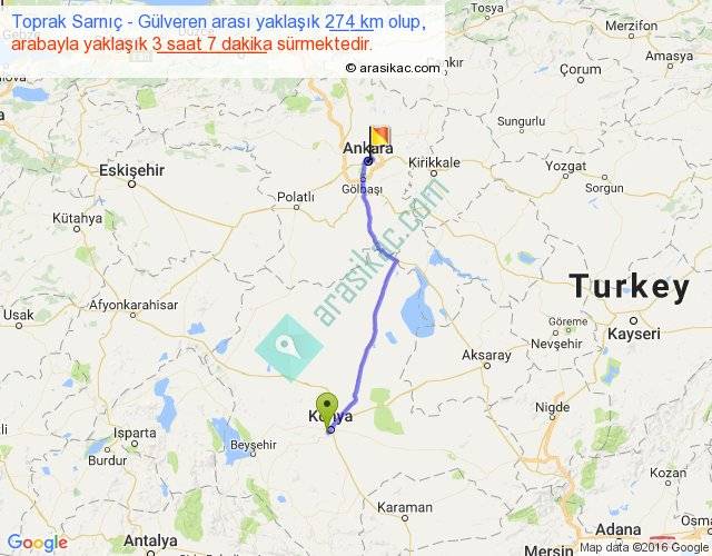 Toprak Sarnıç - Gülveren arası yaklaşık olarak 90 km/h ile yukarıda belirtilen sürede olup, iki yerin kuş uçuşu uzaklığı (mesafesi) 234'dir. Yolculuk otobüsle 4 saat 3 dakika sürmektedir.