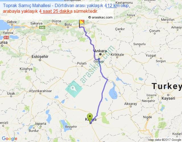 Toprak Sarnıç Mahallesi - Dörtdivan arası yaklaşık olarak 90 km/h ile yukarıda belirtilen sürede olup, iki yerin kuş uçuşu uzaklığı (mesafesi) 319'dir. Eğer belirtilen yerler arasında uçak seferi var ise bu süre uçakla 29 dakika'ya kadar düşebilir. Yolculuk otobüsle 5 saat 44 dakika sürmektedir.