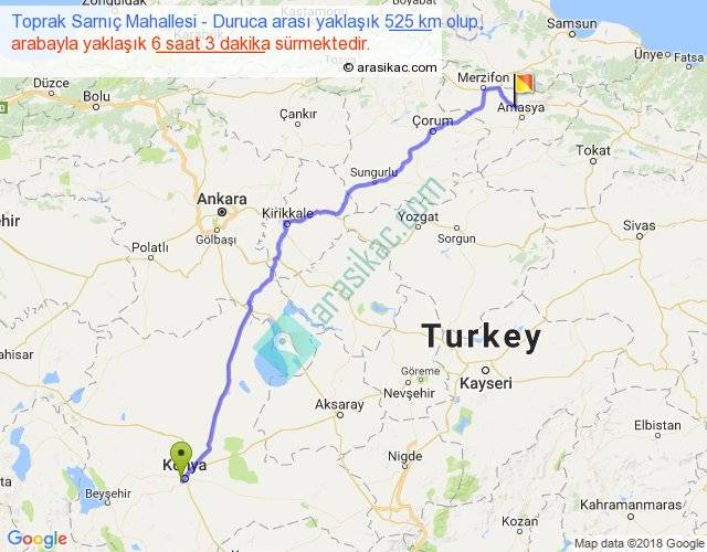 Toprak Sarnıç Mahallesi - Duruca arası yaklaşık olarak 90 km/h ile yukarıda belirtilen sürede olup, iki yerin kuş uçuşu uzaklığı (mesafesi) 427'dir. Eğer belirtilen yerler arasında uçak seferi var ise bu süre uçakla 39 dakika'ya kadar düşebilir. Yolculuk otobüsle 7 saat 51 dakika sürmektedir.