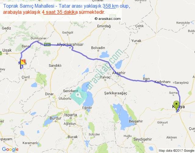Toprak Sarnıç Mahallesi - Tatar arası yaklaşık olarak 90 km/h ile yukarıda belirtilen sürede olup, iki yerin kuş uçuşu uzaklığı (mesafesi) 253'dir. Eğer belirtilen yerler arasında uçak seferi var ise bu süre uçakla 23 dakika'ya kadar düşebilir. Yolculuk otobüsle 5 saat 57 dakika sürmektedir.